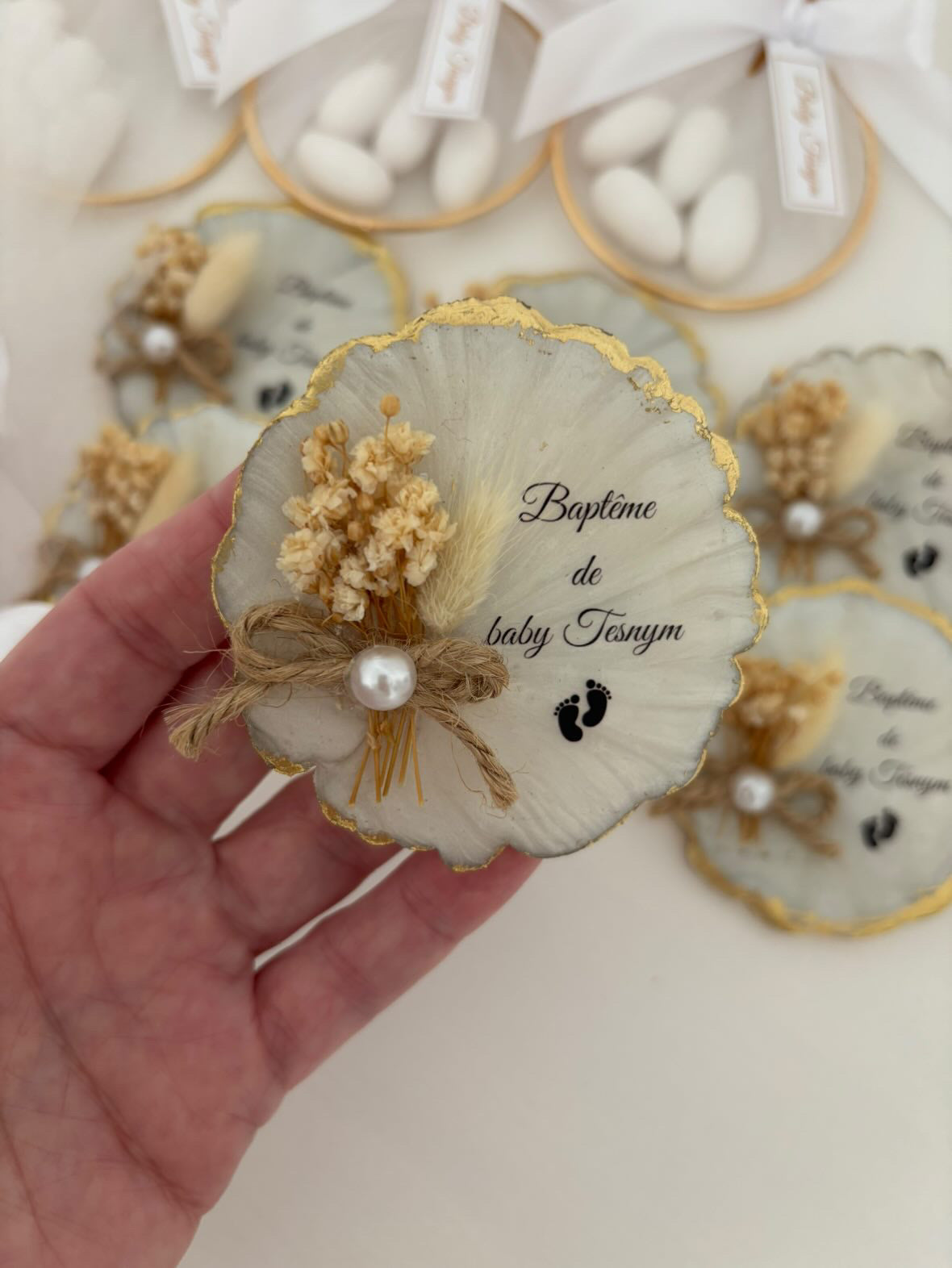 Magnet en résine blanche avec contour doré.